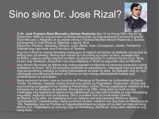 Si Dr. José Rizal ay ipinanganak noong Hunyo 19, 1861, sa Calamba, Laguna, at siya ang pampito sa labing-isang anak nina Francisco at Teodora. Siya ay nag-aral ng iba't ibang kurso sa mga prestihiyosong unibersidad, kabilang ang Ateneo Municipal de Manila at Universidad Central de Madrid, kung saan natamo niya ang mga karangalang 'sobresaliente' sa kanyang mga larangan. Kilala siya sa kanyang mga nobelang 'Noli Me Tangere' at 'El Filibusterismo' na naglalarawan ng mga suliranin ng lipunang Pilipino noong panahon ng mga Kastila at naging biyaya sa pagkakaisa ng bayan.