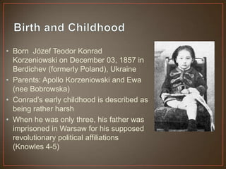 - Joseph Conrad was a prolific Polish writer born in 1857 in Ukraine under Polish rule. He had a difficult childhood, losing both parents by age 12.