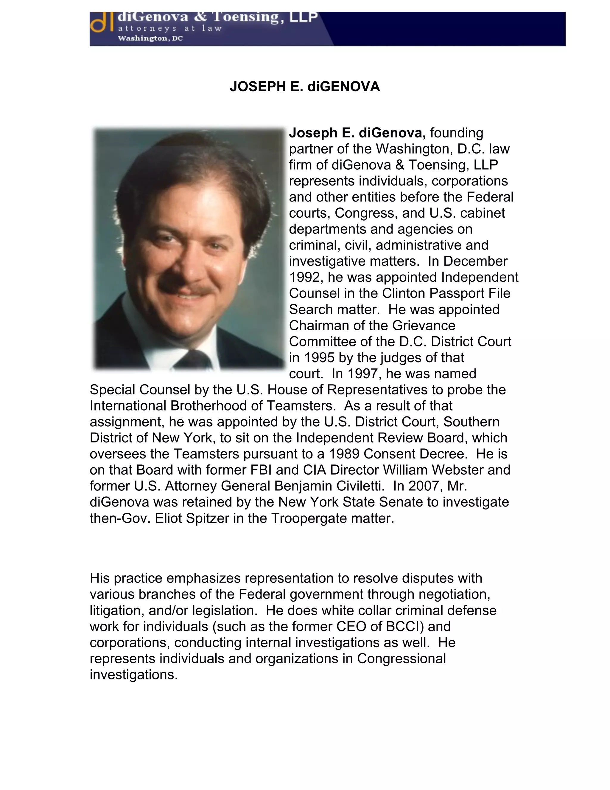 Joseph E. Digenova is a founding partner of the law firm Digenova & Toensing, LLP, specializing in criminal, civil, and administrative matters before federal courts and congressional committees. He has held various notable positions, including independent counsel in the Clinton passport file matter and U.S. attorney for the District of Columbia, overseeing significant criminal cases and investigations. Digenova has published articles and appeared on major television programs, highlighting his expertise in matters of criminal law and congressional oversight.
