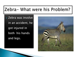 The document summarizes several stories from different sources: Zebra gets injured in an accident and doctors are uncertain about the recovery of his hands; a woman on the Titanic fought to stay with her family but the officer wouldn't allow it and they all made it off safely; a woman lost her son in war and can never see him again after he was in a plane crash; a man was arrested and spent four years in prison before trying to turn his life around with a job and helping a little girl.