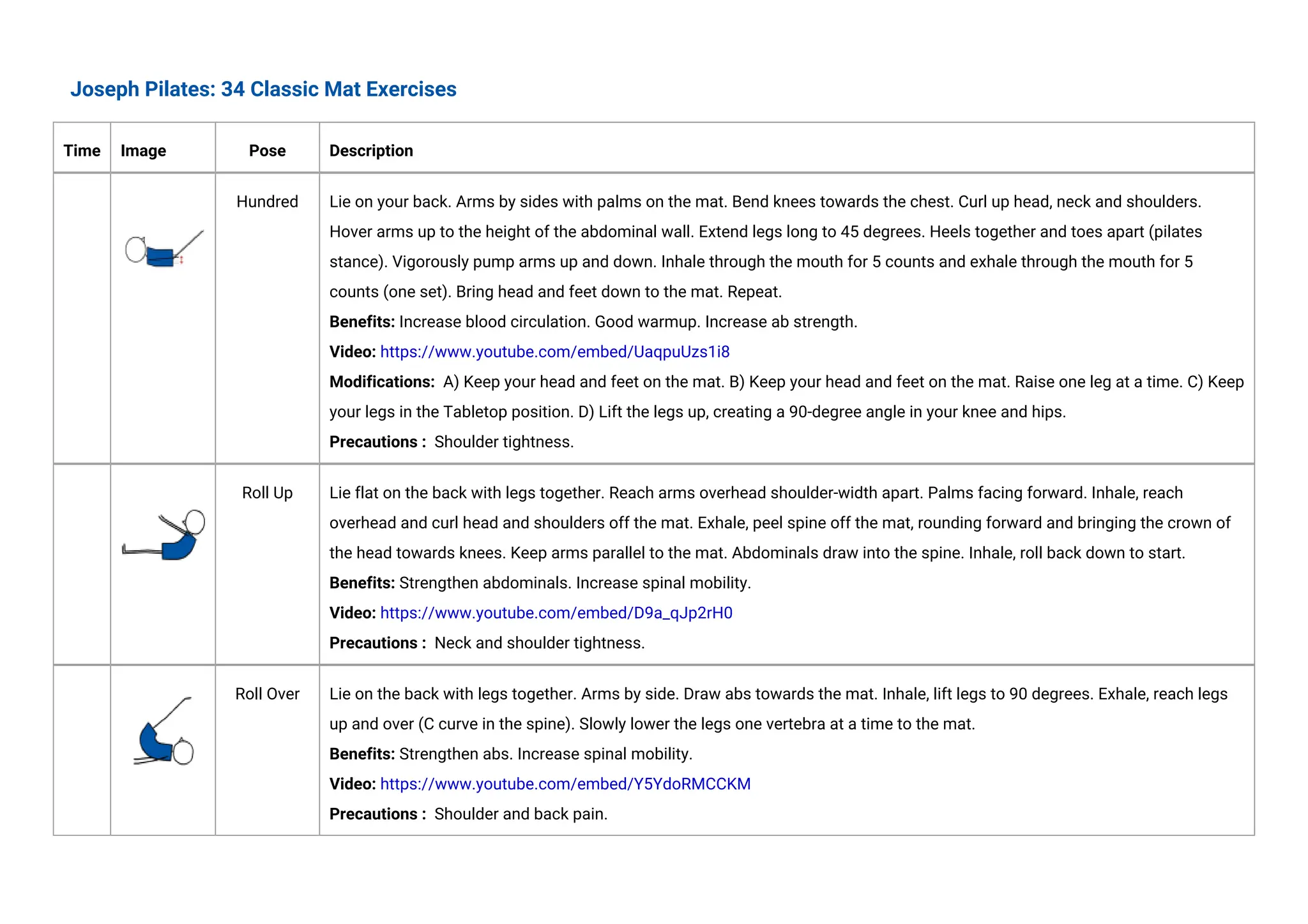 The document outlines a series of Pilates exercises, detailing their positions, steps, benefits, possible modifications, and precautions for safety. Each exercise includes links to instructional videos for a visual guide. The exercises target various muscle groups and aim to enhance strength, flexibility, and spinal mobility.