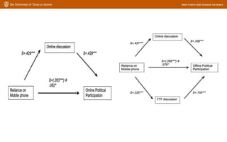 This study examined the influence of mobile application use and interpersonal discussions on political participation. It tested hypotheses based on the Differential Gains Model and Communication Mediation Model. The results showed that online political participation is positively related to the interaction between mobile application use and online discussions. It also found that online and face-to-face discussions mediate the relationship between mobile application use and both online and offline political participation. The study concludes that mobile applications have the potential to complement face-to-face discussions and mobilize individuals for online political activities.