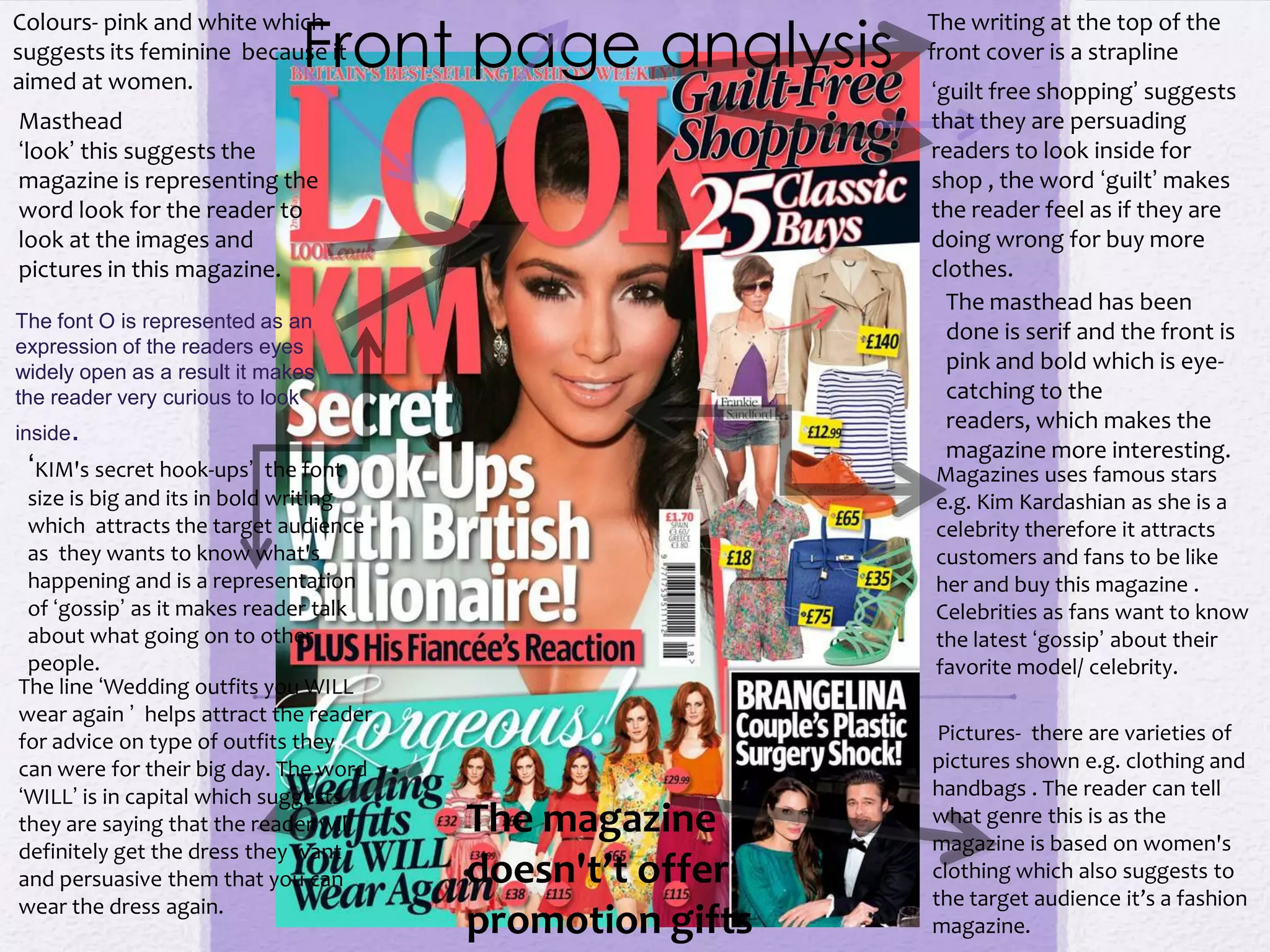 Look magazine targets young women ages 18-30. It aims to provide fashion advice, beauty tips, and celebrity gossip. The front cover uses pink and white colors with bold fonts and a large picture of celebrity Kim Kardashian to attract readers. It also promises wedding outfit advice to get readers interested in looking inside. The magazine appeals to readers through its focus on women's fashion, use of celebrity news, and inclusive portrayal of women across its pages and models.