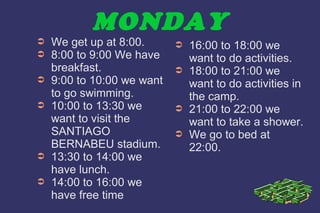 The document outlines the planned daily activities for two boys, Jose and Vlad, attending an activity camp for a week. Each day's schedule is broken into half-hour or hour-long timeslots detailing when they will wake up, eat meals, participate in various recreational activities like swimming, visiting local landmarks like museums and stadiums, and go to bed. The activities are meant to keep them occupied and engaged throughout each day of the camp.