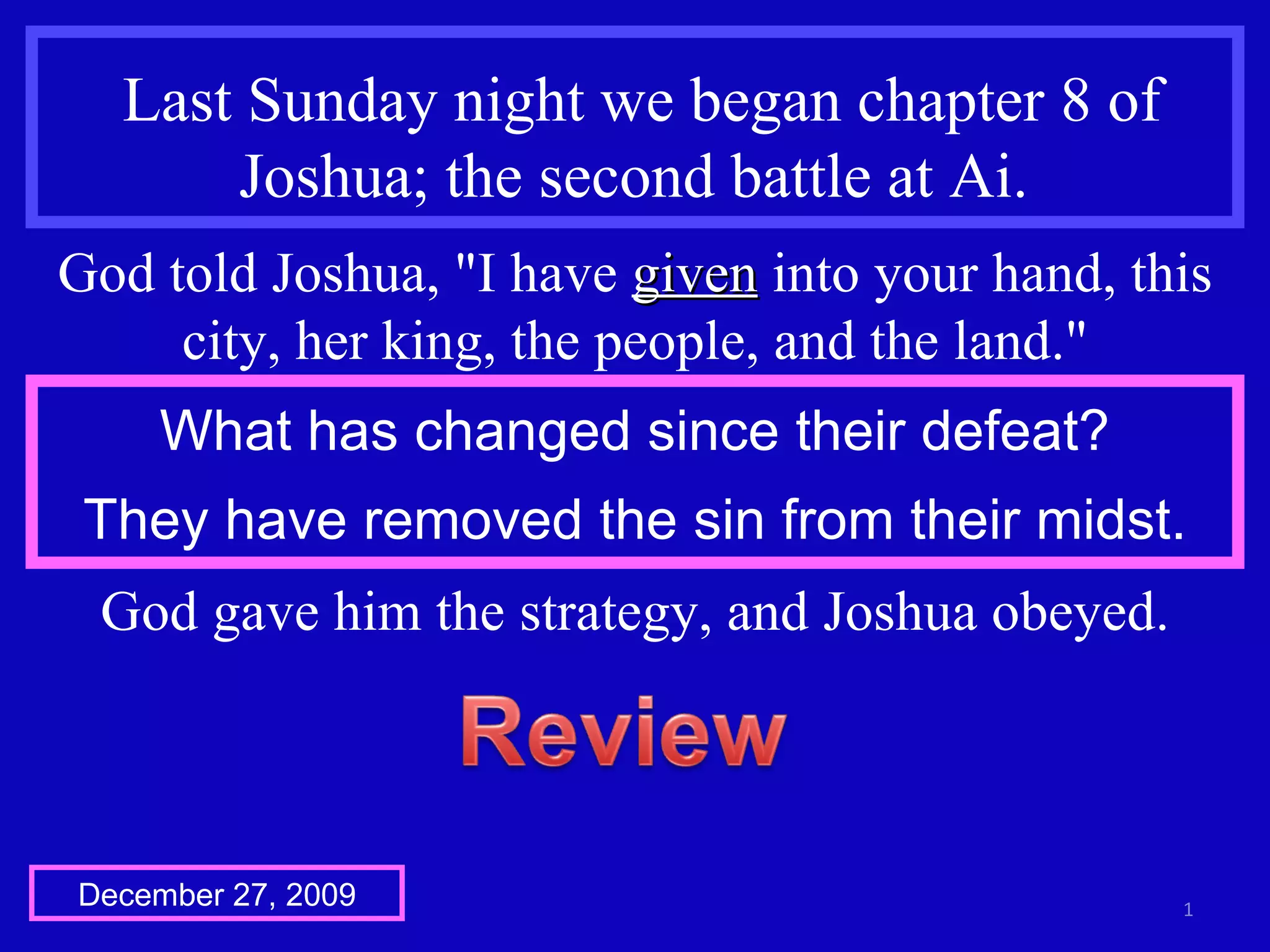 The document summarizes the second battle of Ai from the book of Joshua in the Bible. It describes Joshua's strategy of sending men to lie in ambush behind the city. When the king of Ai saw the Israelites across the valley, he led his men out of the city to attack them. Meanwhile, the ambush entered the city and set it on fire. The men of Ai were trapped between Joshua's men and the ambushers and were defeated, with 12,000 men killed. Joshua hung the king of Ai on a tree and burned the city as God had commanded.