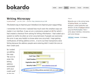 Microcopy refers to short phrases, sentences, or single words used in interfaces to provide contextual help and reduce friction. It targets specific user questions or concerns. While small, microcopy can have a big impact on improving interfaces since most interactions involve words. Examples include sign-up prompts, settings labels, error messages, and welcome messages. Using helpful microcopy throughout an interface can make users happier and more loyal by clearing their path and making them feel supported. Getting started requires identifying areas of confusion through usability testing and support feedback to add targeted microcopy.