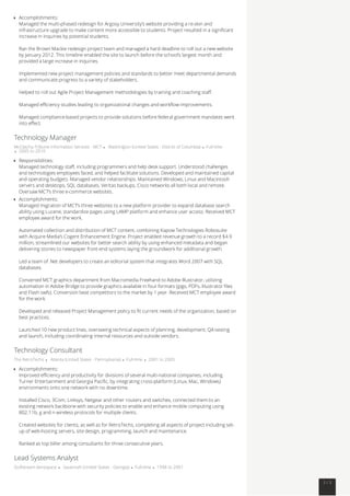 Joshua Quattlebaum is an innovative technology leader seeking a creative position. He has over 15 years of experience in various roles including senior program manager, IT consultant, project manager, and systems analyst. His background includes managing teams, implementing new technology systems, and translating technical information for non-technical audiences.