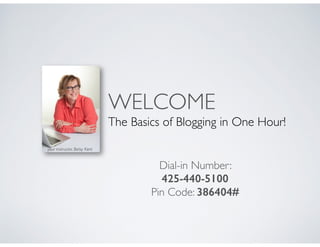 This document outlines a blogging workshop led by Betsy Kent, aimed at beginners who want to improve their website traffic through blogging. It introduces three key tools for successful blogging: understanding search engine optimization, generating blog topics, and using a simple blog template. The session includes a free blogging strategy session offer, encouraging participants to engage and learn how to enhance their online presence.