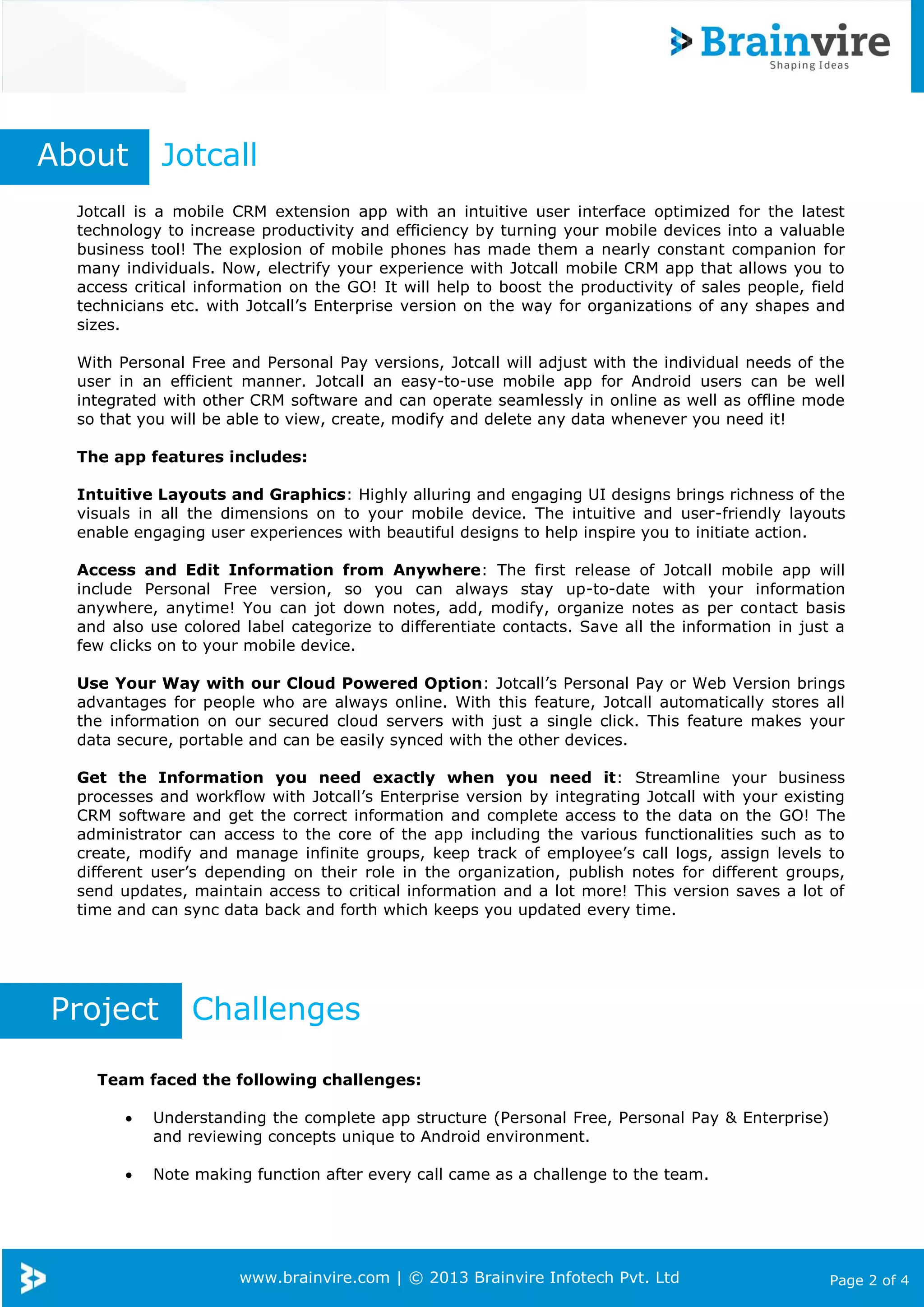 Jotcall is a mobile CRM extension app designed to enhance productivity for salespeople and field technicians through intuitive interfaces and seamless integration with existing CRM software. It offers personal free and pay versions, and an enterprise version that allows for extensive data management and sync features, ensuring secure and easy access to critical information. The app's architecture leverages Android OS capabilities and integrates with popular CRM systems like Salesforce, SugarCRM, and VtigerCRM to provide users with reliable business tools on the go.