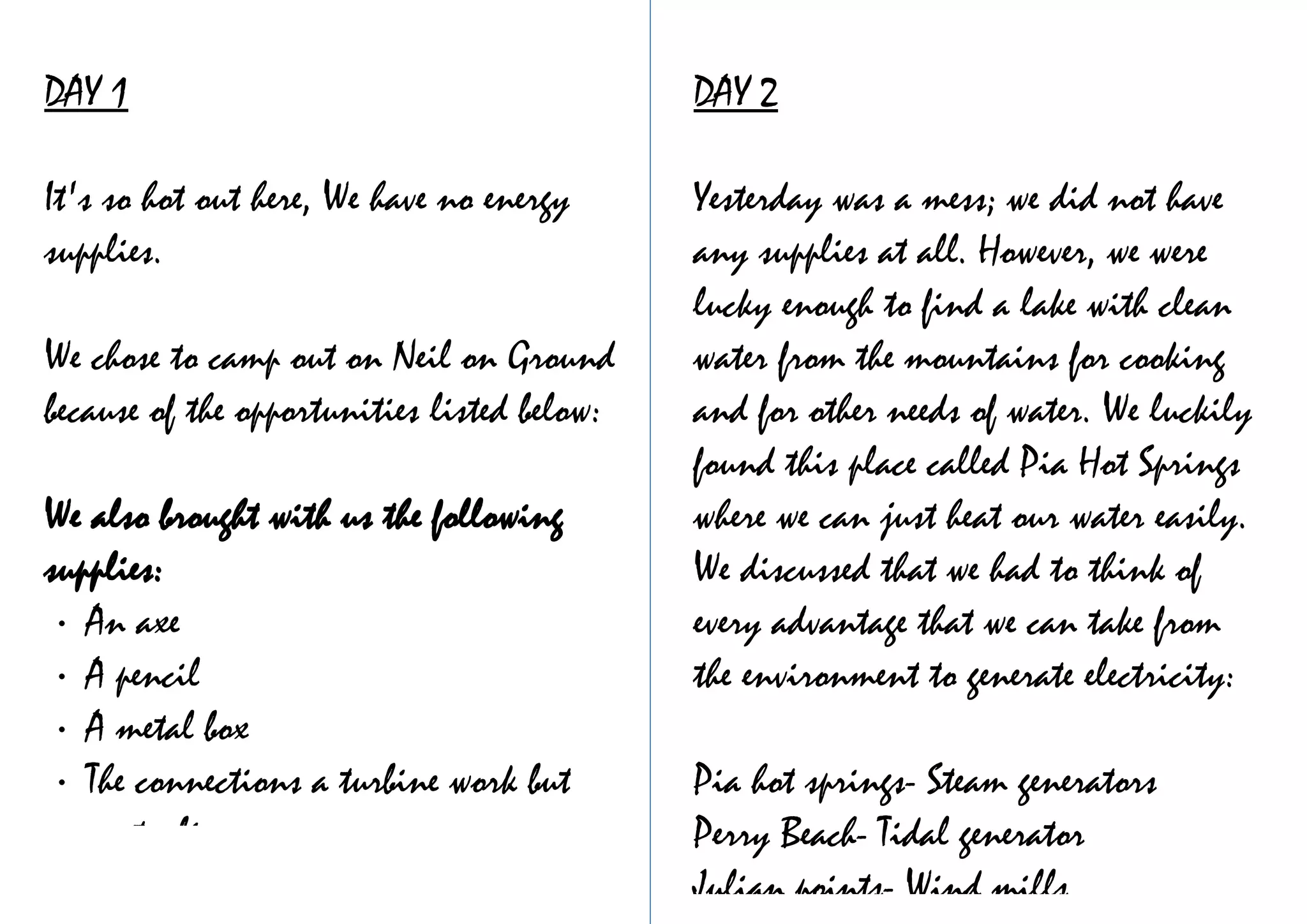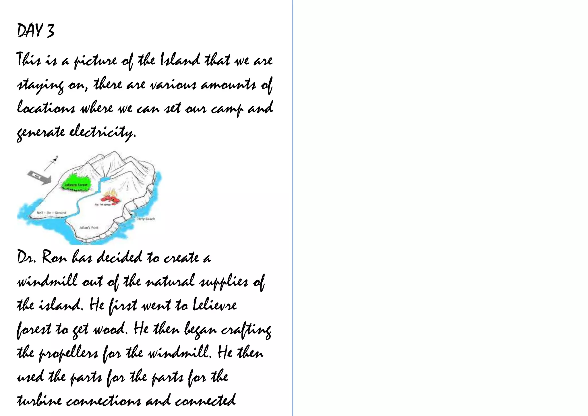 The document describes a group camping on an island over the course of 3 days. On the first day, they camped at Neil on Ground because of opportunities to generate electricity using the environment. They brought limited supplies. The second day, they found a lake for water and discussed using steam, tidal, and wind generators from hot springs, beaches, and points on the island. On the third day, Dr. Ron began crafting a windmill from wood and parts to generate electricity using natural resources on the island.
