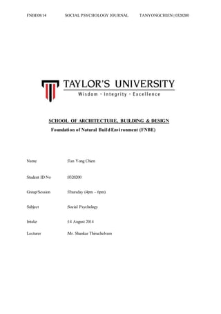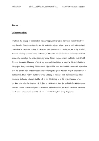 - The document is a student's journal entries for a social psychology class discussing various concepts including confirmation bias, cognitive dissonance, spotlight effect, halo effect, and observational learning.
