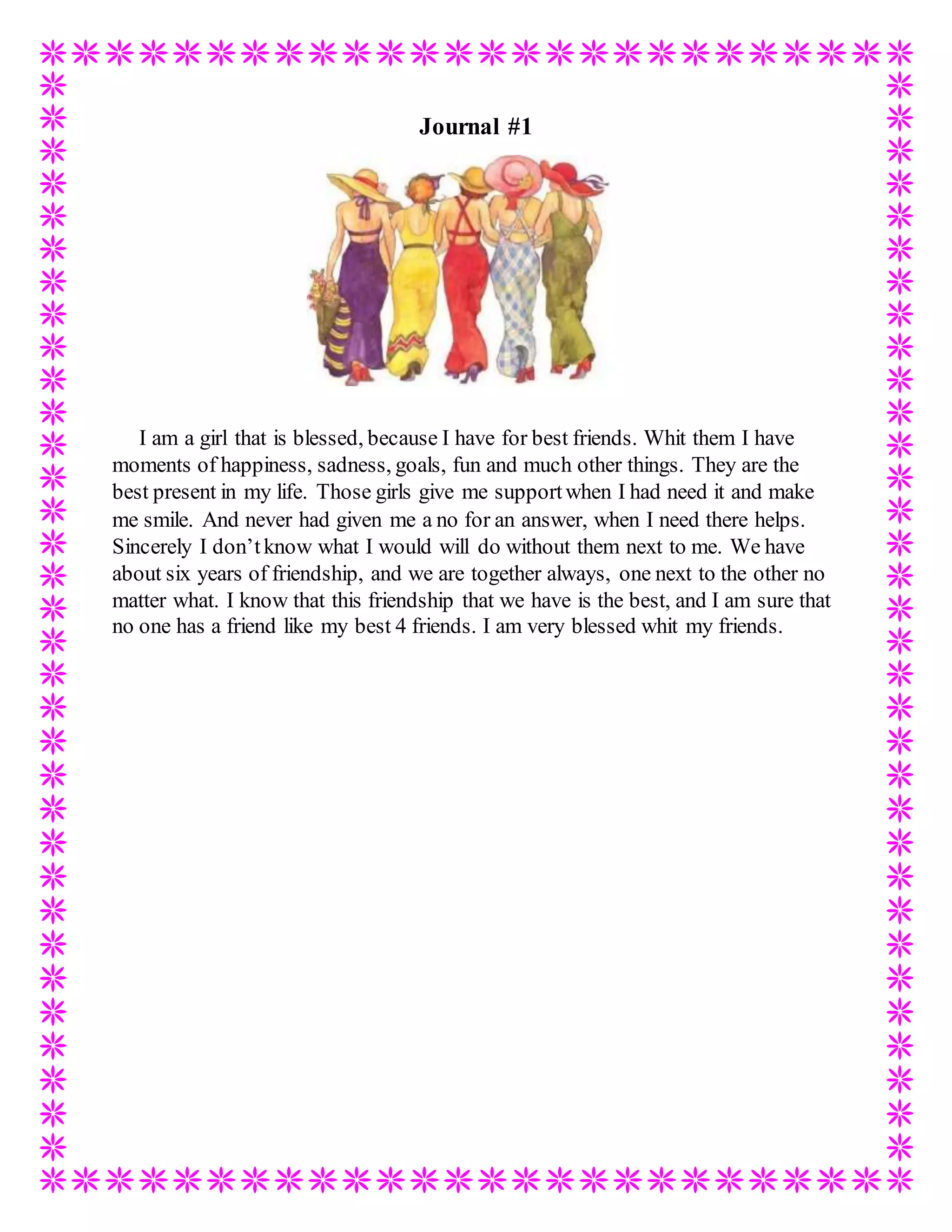 This girl considers herself blessed to have four best friends who have shared many happy and sad moments together over their six years of friendship. She relies on their constant support, as they are always willing to help her and make her smile, and feels lost without them by her side through everything.