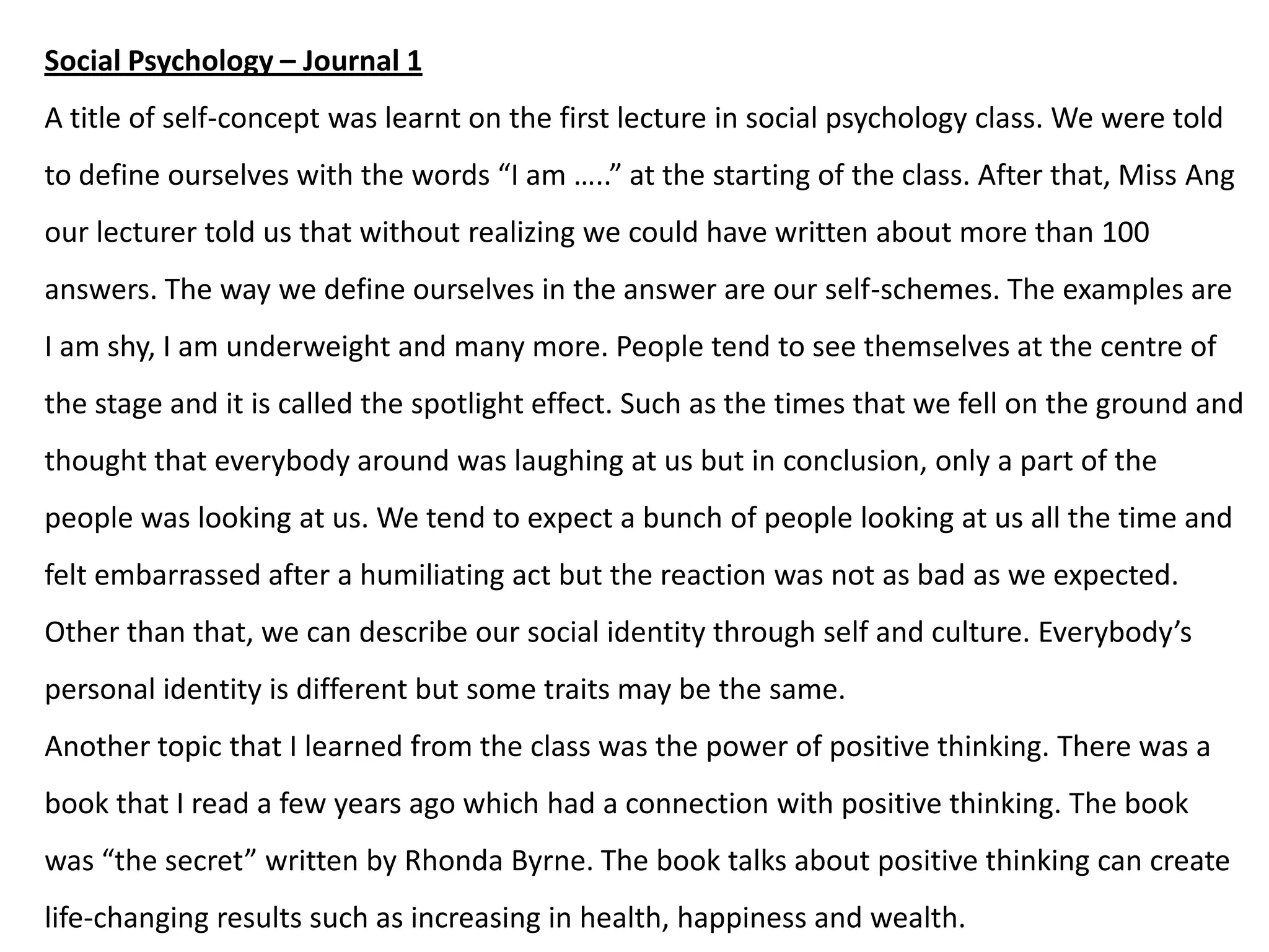 2) It describes an exercise where students wrote down how they define themselves, and how people tend to see themselves as the center of attention more than others do.