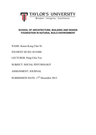 Karen Kong wrote two journal entries about her social psychology class. In the first journal, she discusses taking a social psychology exam and feeling nervous. She was relieved the exam was over and happy her class was cancelled the following week so she could sleep. In the second journal, she discusses a new lesson on conformity and group behavior. Her lecturer returned the exam marks, and Karen was relieved that she did okay. She also met with her group to discuss an assignment and divide tasks.