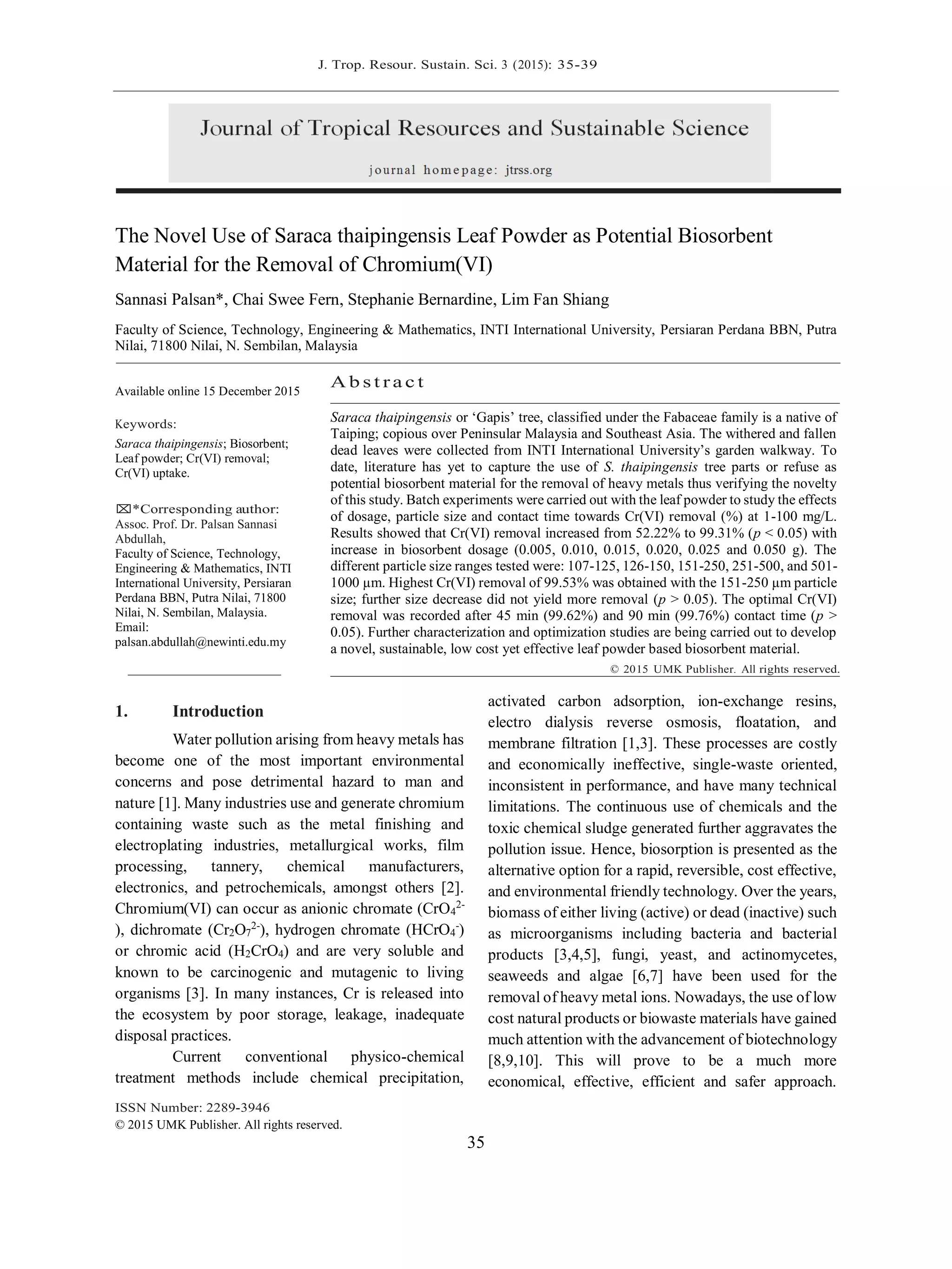 This document summarizes a study that investigated the use of leaf powder from the Saraca thaipingensis tree as a potential biosorbent material for removing chromium(VI) from water. Batch experiments were conducted to examine the effects of biosorbent dosage, particle size, and contact time on chromium(VI) removal. Results showed that chromium(VI) removal increased from 52% to 99% as biosorbent dosage increased from 0.005g to 0.050g. The optimal particle size was 151-250 μm, which achieved 99.53% removal. Maximum removal of 99.62-99.76% was achieved within 45-90 minutes of contact time. Further characterization and optimization studies are being conducted to