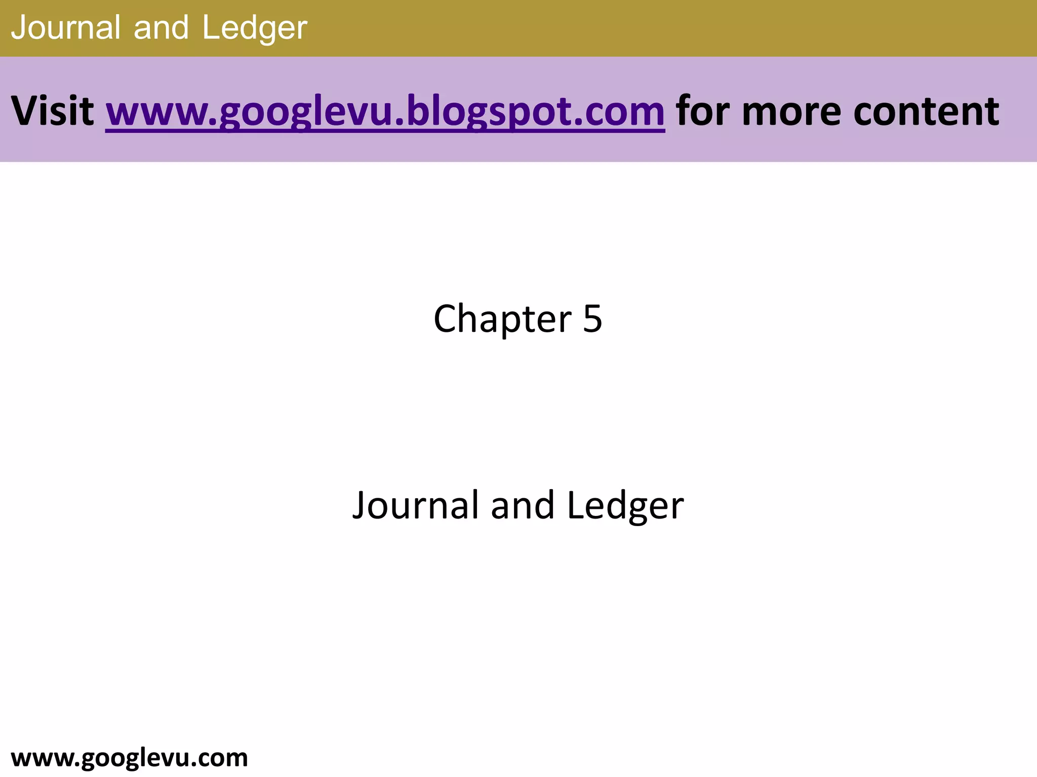 Chapter 5 discusses the journal and ledger, introducing key concepts such as the meaning of accounts, the roles of debit and credit, and classifications of accounts (traditional and modern). It explains the process of journalizing, including simple and compound entries, and details the structure and purpose of ledgers. Additionally, it covers the sub-division of journals into various types for specific transactions and the mechanics of balancing ledger accounts.