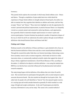The article critiques the complex intersections of fitness and fatness experienced by larger female athletes, emphasizing the need for a feminist understanding of these terms beyond societal pressures. It highlights how women's empowerment through fitness often remains unfulfilled due to the cosmetic framing of fitness and the influence of biased media and secondary scientific sources. Ultimately, the author argues for a more nuanced definition of fatness and fitness that acknowledges broader cultural contexts and challenges existing gender norms.