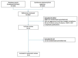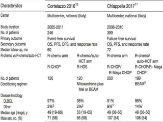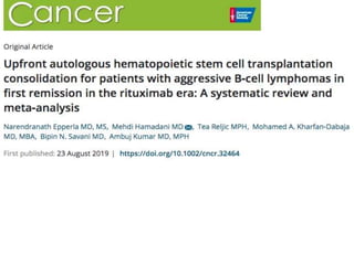 This systematic review and meta-analysis evaluated the role of upfront autologous hematopoietic stem cell transplantation (auto-HCT) consolidation for patients with aggressive B-cell lymphomas in first remission in the rituximab era. The analysis included 4 randomized controlled trials comparing R-chemotherapy alone to R-chemotherapy plus auto-HCT. There were no differences in overall survival, progression-free survival, or response rates between the two treatment arms. Patients receiving auto-HCT had significantly higher rates of grade 3-4 infections and gastrointestinal toxicities. The review concludes that in the rituximab era, auto-HCT consolidation does not provide a benefit over chemotherapy alone, even for