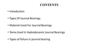 This document discusses journal bearing layout and failure identification. It begins by introducing journal bearings and the types of failures that can occur, including pitting, fatigue, erosion, cavitation, corrosion, and issues with the collar/runner/journal surface. It then provides details on each type of failure, describing the appearance and root causes. For each failure type, it recommends rectification actions such as filtering the oil, cleaning components, restoring surfaces, and addressing the underlying operational issues that led to the failure.