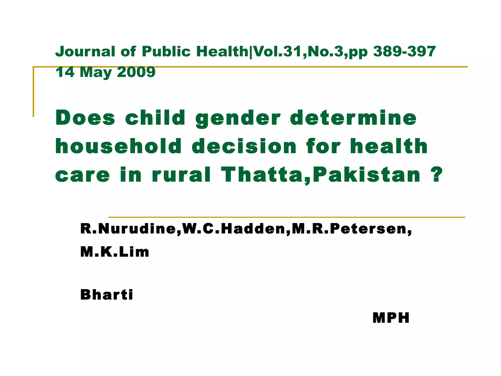 This study examined whether child gender determines household healthcare decisions in rural Thatta, Pakistan. The study found that while illness was reported more for infant girls, there was no significant difference in care seeking or healthcare expenditures between boys and girls. Girl children had higher mortality ratios than boys. The presence of a girl's school in a village was associated with lower rates of hospitalization, suggesting communities that value girls' education may also value their health more. Overall, the study found no evidence that households in Thatta differentially seek healthcare for boys over girls.