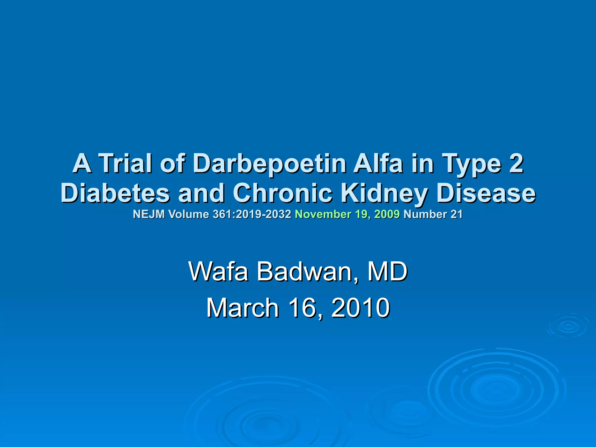 This study tested whether treating anemia in patients with type 2 diabetes and chronic kidney disease using darbepoetin alfa would reduce rates of death and cardiovascular events compared to a placebo. Over 4,000 patients were randomized to receive darbepoetin alfa or placebo, with the goal of maintaining a hemoglobin level of 13.0 g/dL in the treatment group. The study found no significant difference in rates of death, cardiovascular events, or end-stage renal disease between the groups. However, there was an increase in stroke risk observed with darbepoetin alfa treatment.