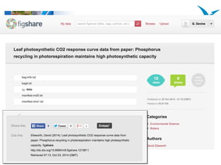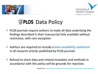 The document discusses data sharing requirements for publishing in PLOS journals. PLOS requires authors to share all underlying data without restriction. Acceptable methods include depositing data in public repositories like Dryad or Figshare. The document also discusses other data repositories and journals, as well as obtaining identifiers like Data DOIs from services like Cite My Data. It provides an example of how the Hawkesbury Institute for the Environment publishes data using their HIEv application and Figshare to obtain DOIs for datasets associated with journal publications.