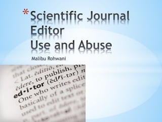 The document discusses the responsibilities and ethical considerations of journal editors, highlighting the potential for misuse of their position to increase their own citations and the journal's impact factor through self-citation and coercive practices. It provides examples of editors exploiting their roles, including specific cases of self-citation and editorial abuses in various journals. Additionally, it notes the prevalence of citation coercion in academia, particularly among younger faculty, and the need for transparent guidelines for handling submissions and misconduct.