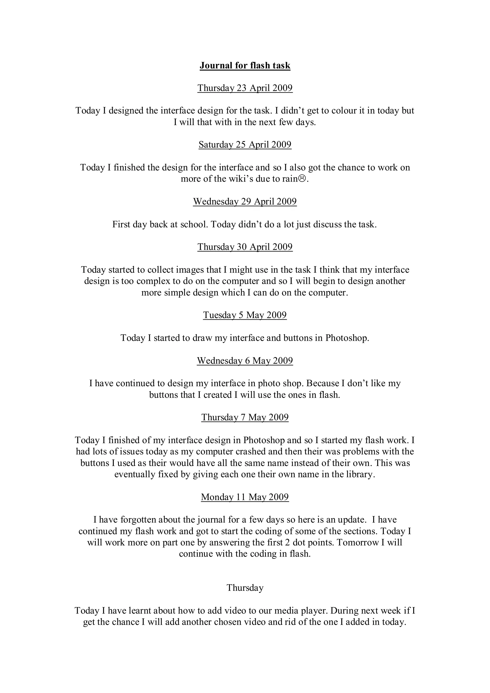 This journal documents the process of designing an interface for a flash task between April 23rd and May 22nd. Key events include designing the interface in Photoshop, running into issues with buttons in Flash, adding video and music, and researching hardware and software specifications for the task. The journal ends with finalizing designs, annotations, and handing in the required materials.