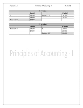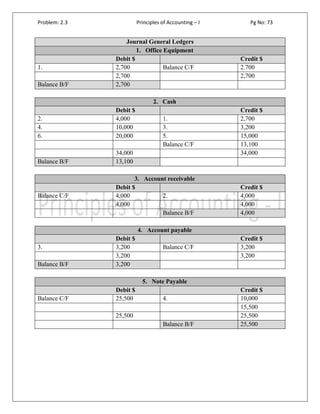 This document contains journal entries and general ledger balances for various accounts, including office equipment, cash, accounts receivable, accounts payable, note payable, trucks, and capital. The balances brought forward and carried forward are recorded for each account.
