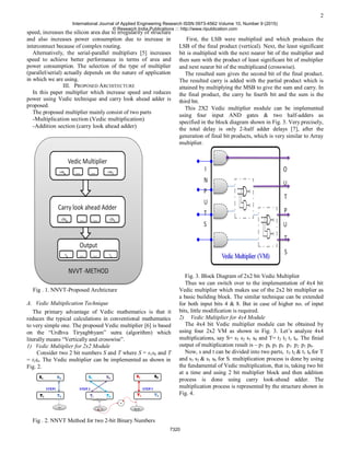 The document describes a proposed low power, high speed multiplier circuit designed using a technique called New Vedic VLSI. The multiplier uses a Vedic multiplication method to generate partial products faster. An addition section with a carry look ahead adder is used to sum the partial products, providing faster operation than a ripple carry adder. Simulation results showed the proposed design consumed 41.868 μw of power over 10ns, compared to 65.4 μw for a design using a ripple carry adder, for a 23.592 μw power reduction. The high speed, low power multiplier design is suitable for applications like digital signal processors that require efficient multiplication.