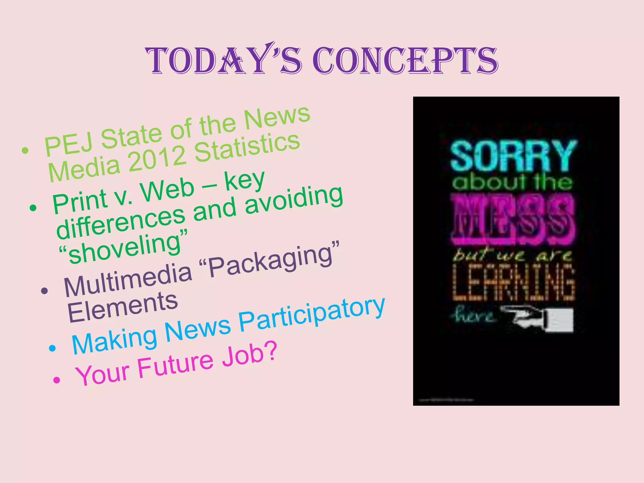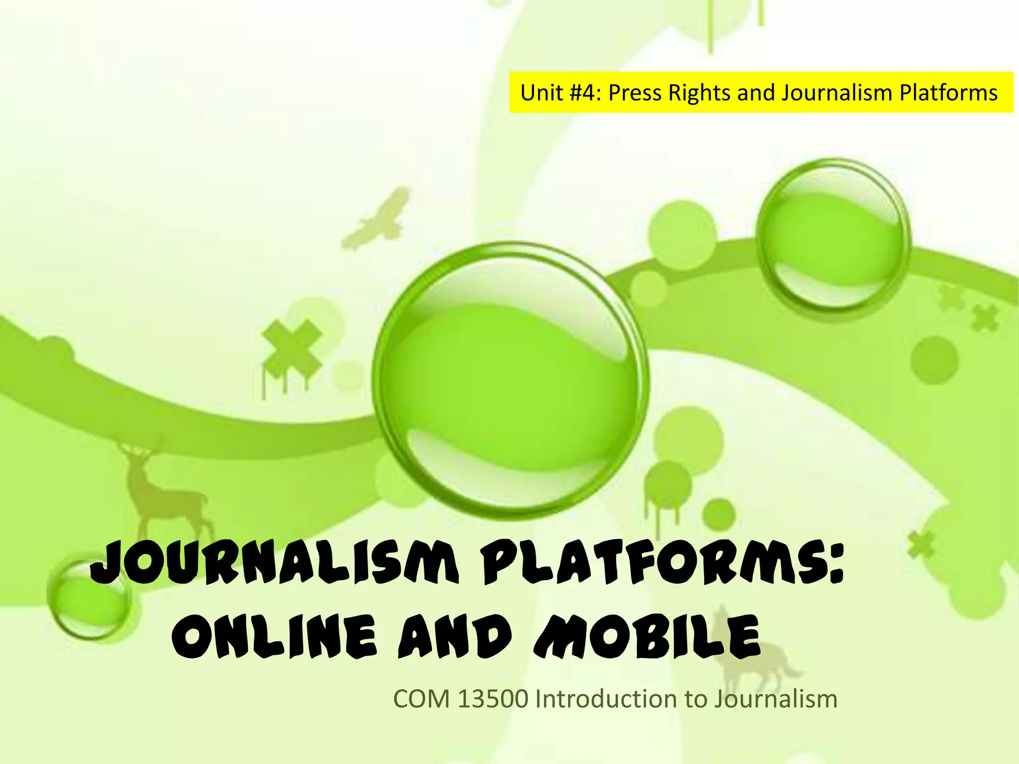 This document discusses different journalism platforms and how stories are presented online versus print. It notes that online stories should be chunked into shorter paragraphs and sentences with subheads, bullets and lists. Online stories also benefit from links to other resources, multimedia like photos and video, and elements that encourage user participation through comments, surveys and interactive content. The document introduces several types of multimedia journalists including solo journalists, video journalists, and mobile journalists, and provides a list of common multimedia equipment used in online journalism.