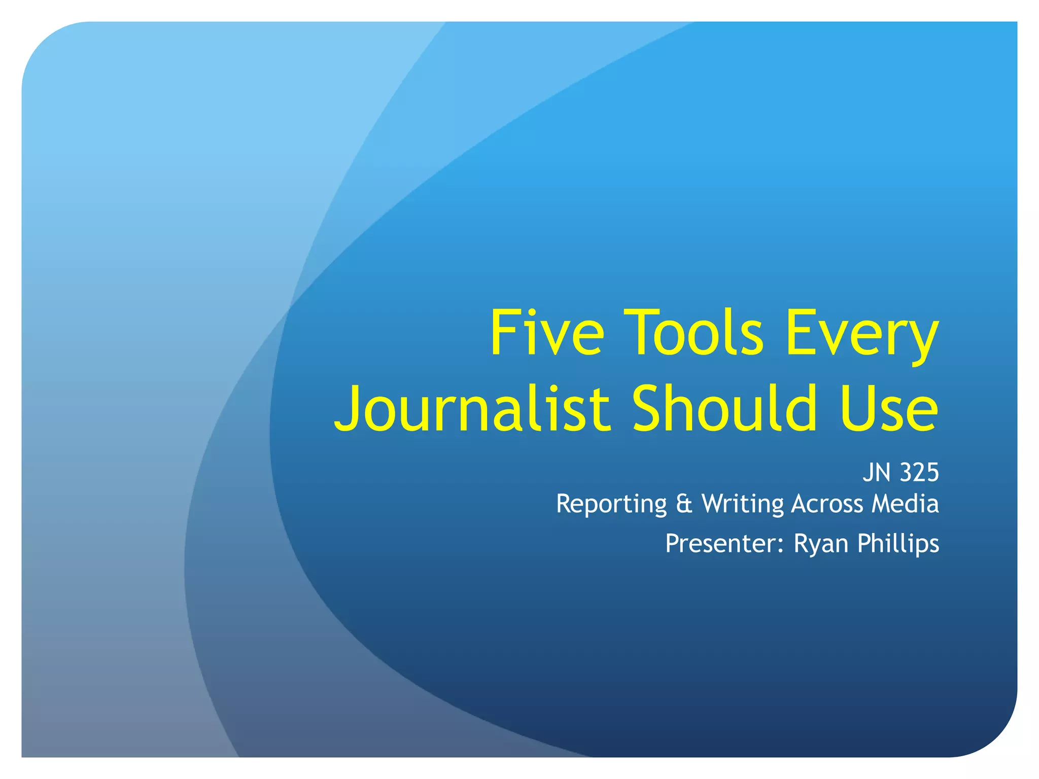 This document discusses five tools that journalists should use: dictation software, online video platforms, visual-based social media, mobile word processors, and mobile note-taking software. It provides examples of popular tools in each category, such as Dragon dictation software, Vine, Instagram, Docs To Go, and Evernote. While these tools can save time and help disseminate information more quickly, the document emphasizes that they should be used to enhance, not replace, fundamental journalistic skills like writing, interviewing, and note-taking.