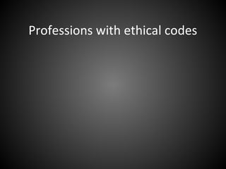 The document discusses the codes of ethics that showcase standards and best practices in various professions such as medicine, law, and journalism. It addresses the importance of accountability and the enforcement of ethical codes, highlighting historical developments like the 'Canons of Journalism' established by the American Society of Newspaper Editors. Additionally, it examines the Society of Professional Journalists' code adopted in 1996, emphasizing principles such as truth, harm minimization, and independence.