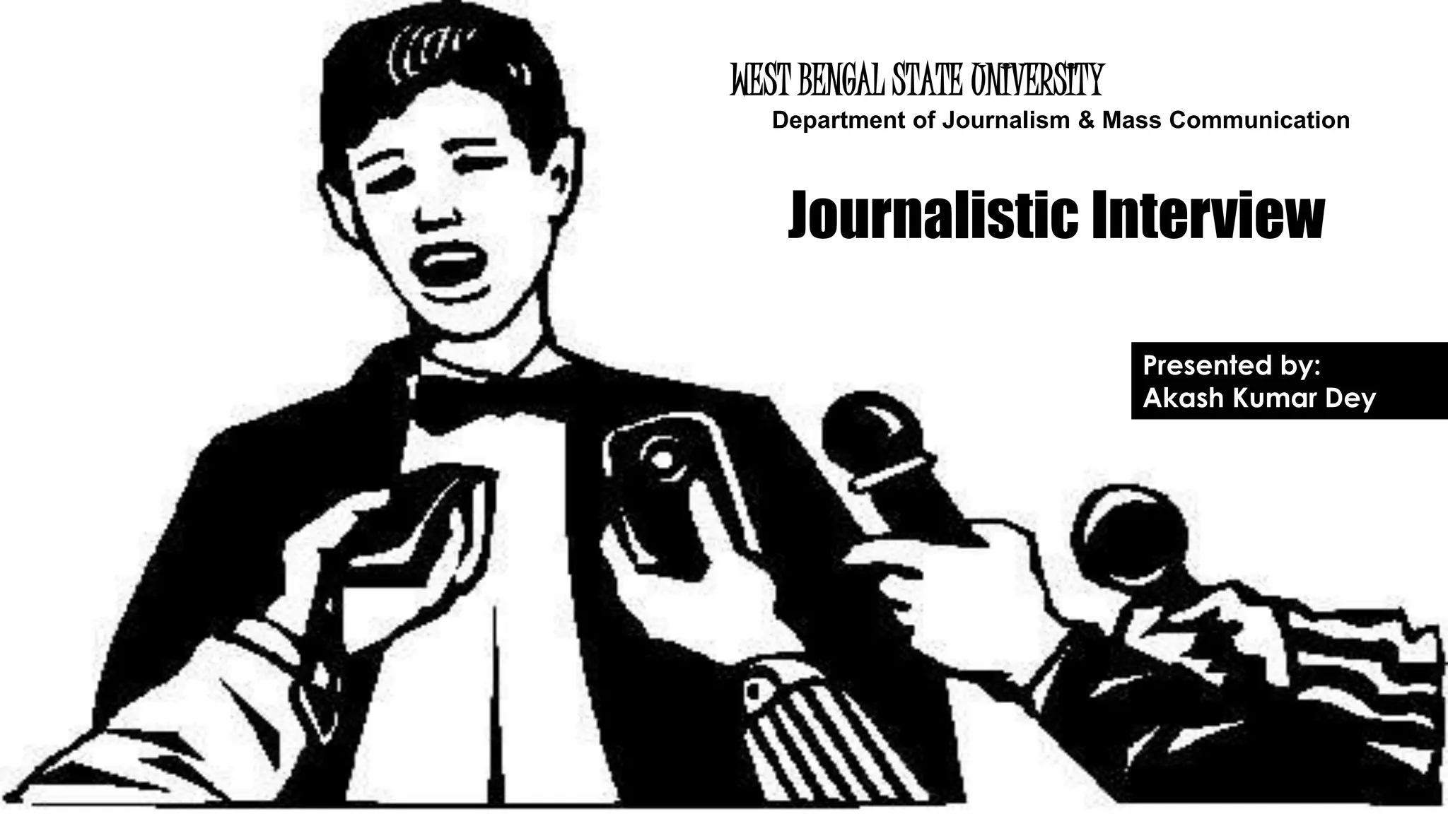 The document discusses the importance of interviewing in journalism, highlighting its role in providing facts, expertise, and credibility. It outlines various types of journalistic interviews and presents a step-by-step guide for interview planning, as well as dos and don'ts to follow during interviews. Key principles emphasized include preparation, building rapport, and maintaining a logical flow of questions.