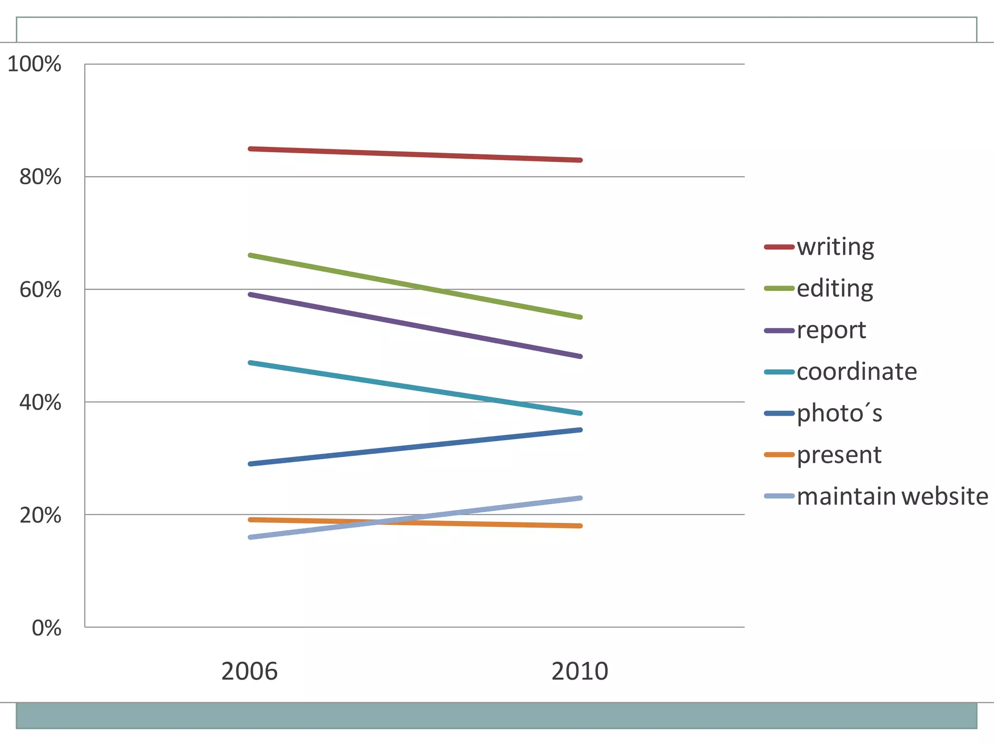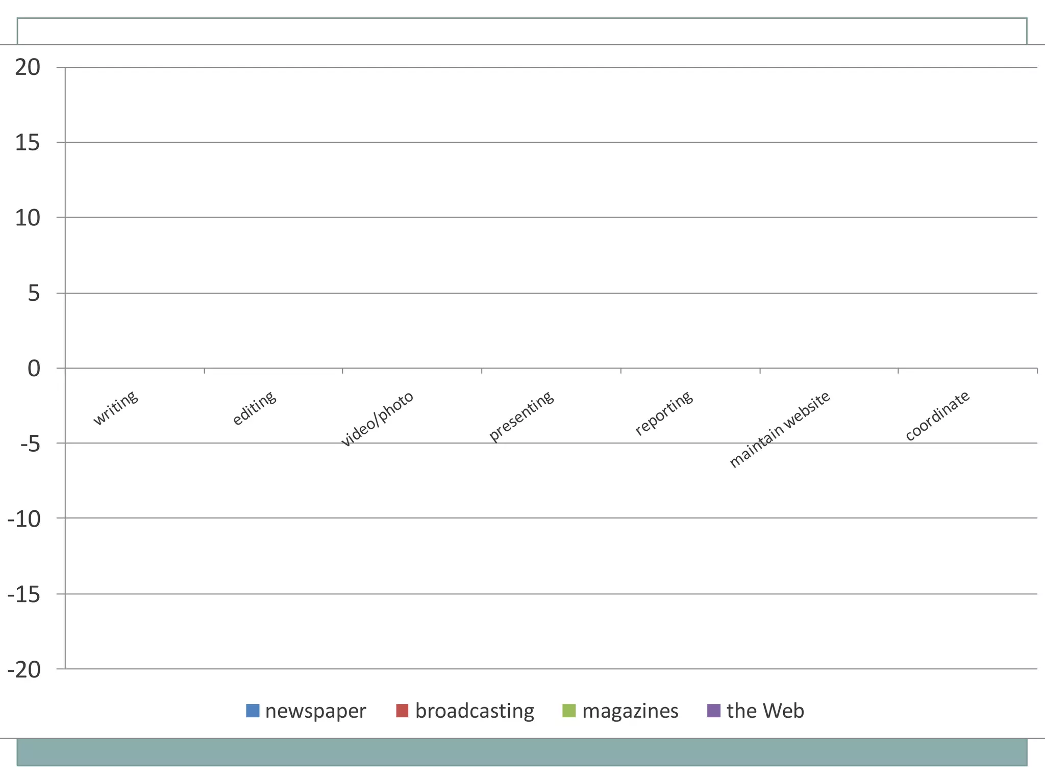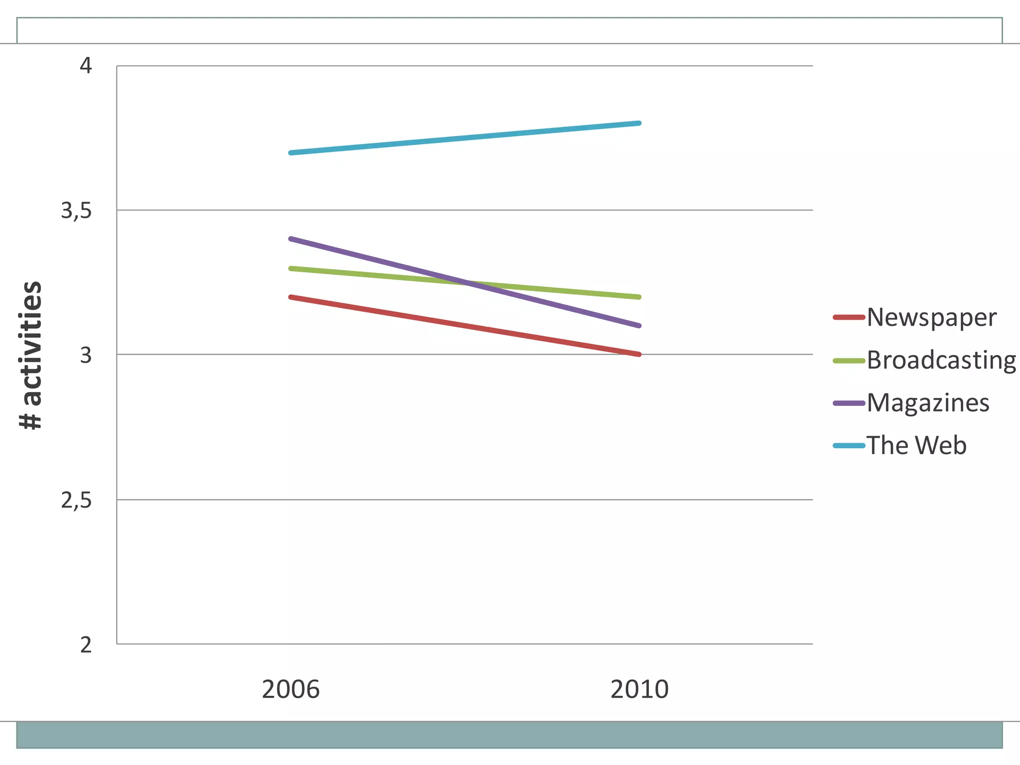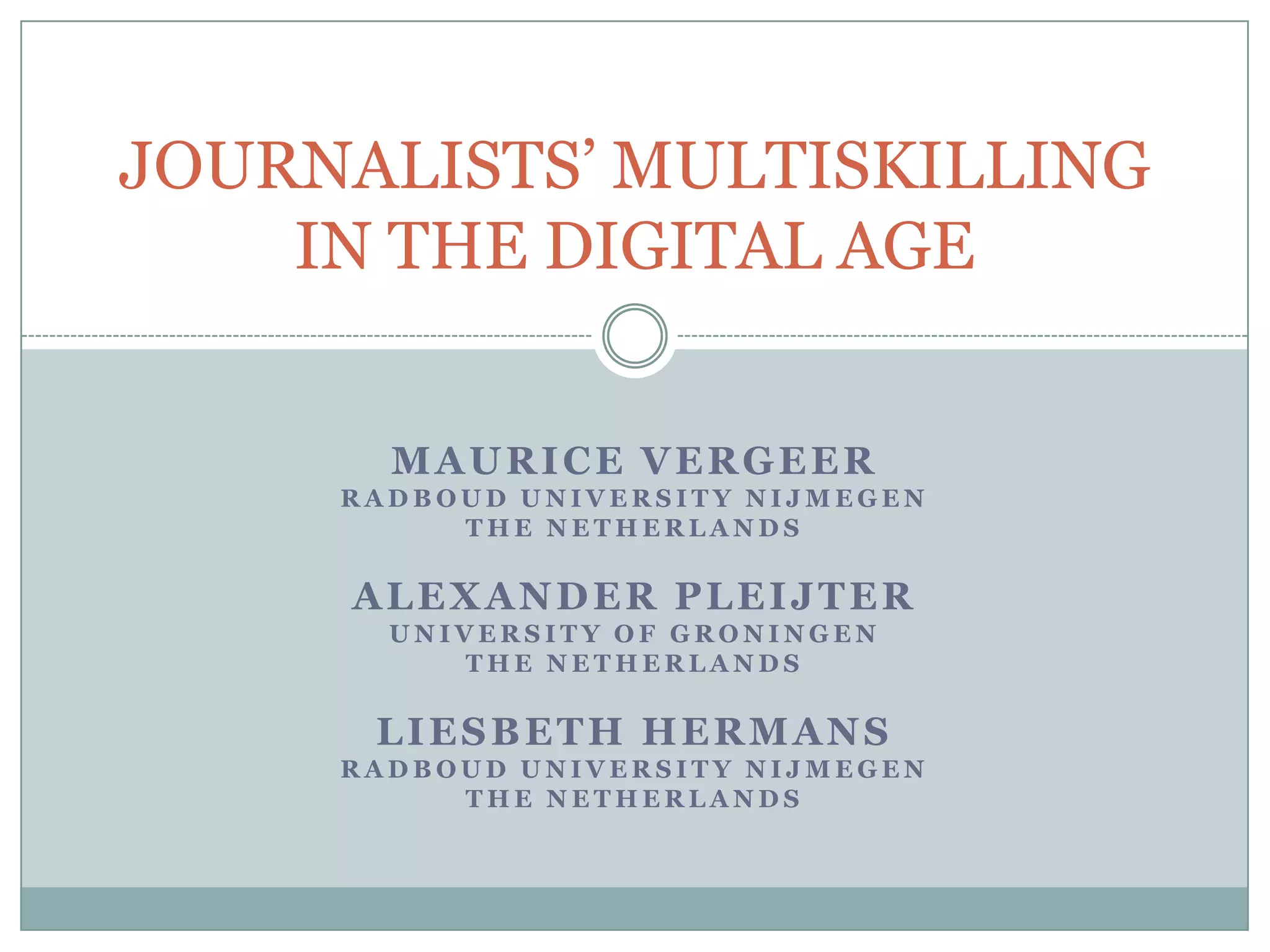 This document summarizes research on journalists' multiskilling activities in the digital age. The study analyzed data from a Dutch Journalism Association membership database from 2006 and 2010 to identify changes in the types of media platforms journalists work for and the activities they perform. The findings show that journalists generally perform 3-4 activities, most commonly writing, editing, and reporting. While the overall number of activities has remained stable over four years, there have been changes within different media types, with multiskilling increasing most for online media but decreasing for traditional media. Certain activities like editing and reporting decreased across all media types, while writing and recording videos/photos increased for some media.