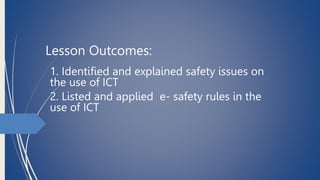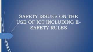 This document discusses safety issues and e-safety rules regarding the use of information and communication technology (ICT). It identifies several risks of using ICT like exposure to inappropriate content, cyberbullying, privacy issues, and health issues from overuse. The document also lists minor misuses of ICT in schools like plagiarism and using other students' login information. It emphasizes the importance of e-safety to educate students about both benefits and risks of technology. Specific e-safety rules discussed include only using authorized logins, logging off after use, and restricting personal devices and cameras in class. The document concludes by providing guidelines for safely setting up an educational technology room.