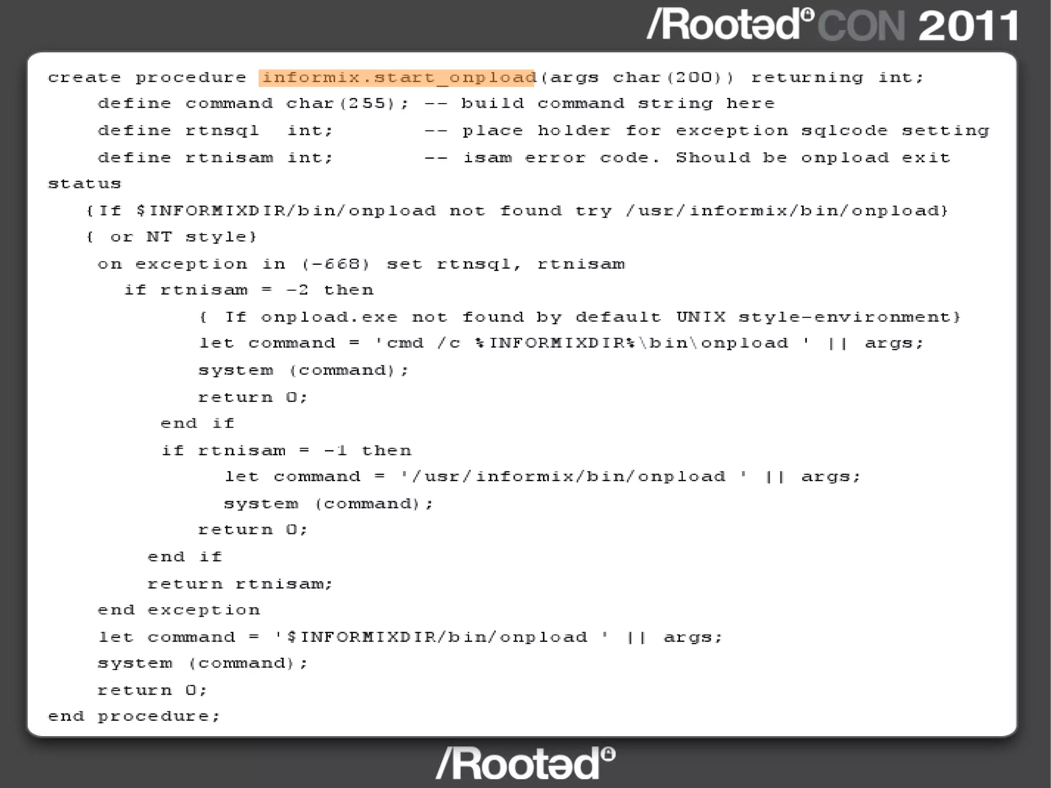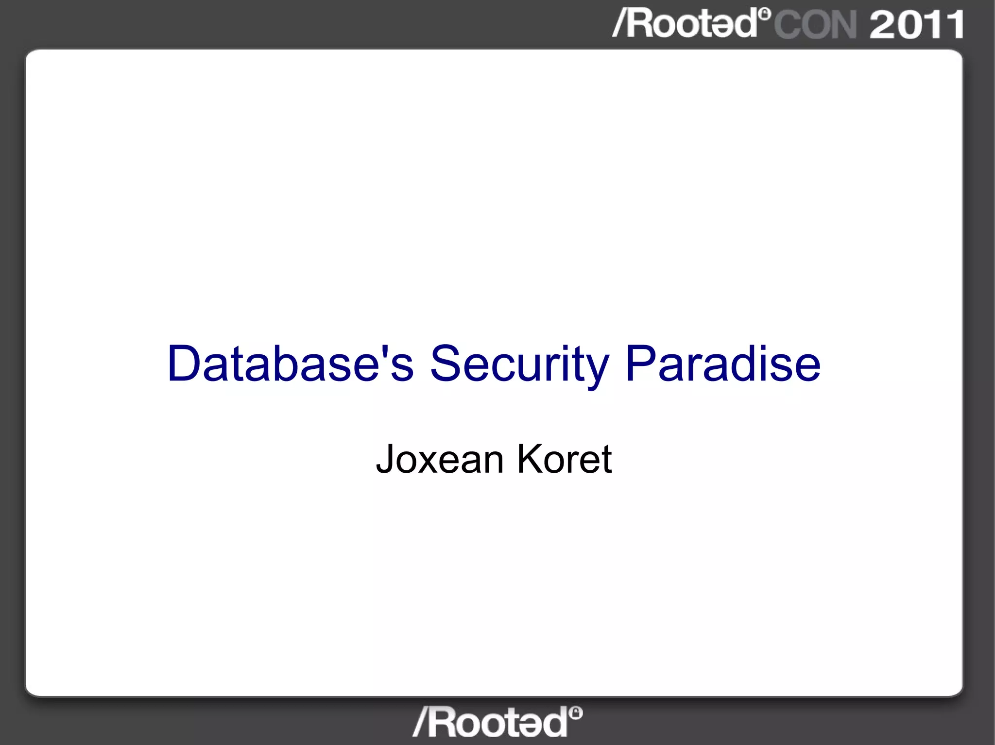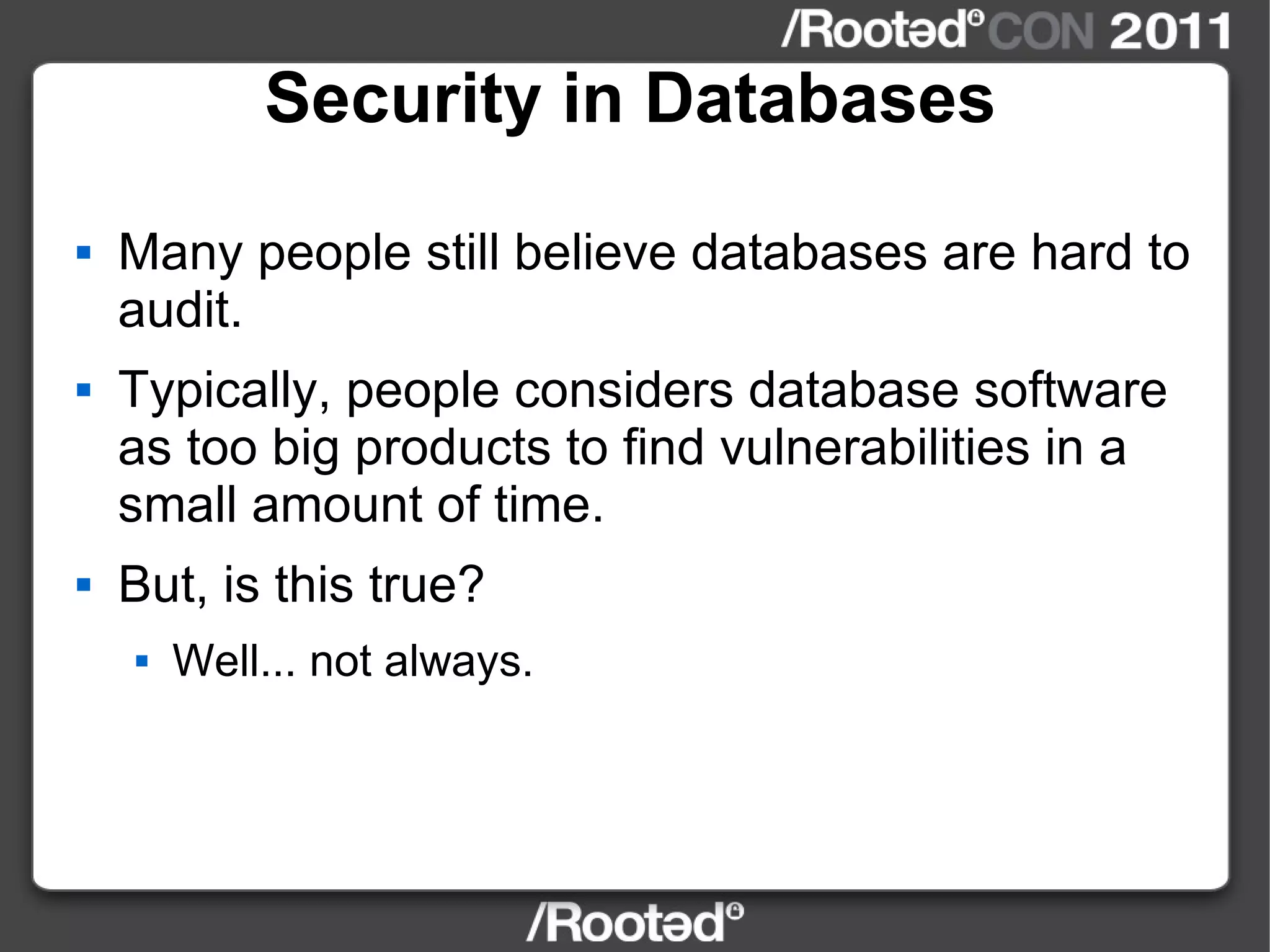 The document discusses vulnerabilities found in various database software products through analyzing their code and installation directories. Local privilege escalation bugs were found in IBM DB2 and Informix by exploiting how environment variables and shared libraries were handled. Remote code execution bugs were also discovered in UniData and Informix through fuzzing protocols and by exploiting unsafe functions. The document encourages searching for more bugs in database software.