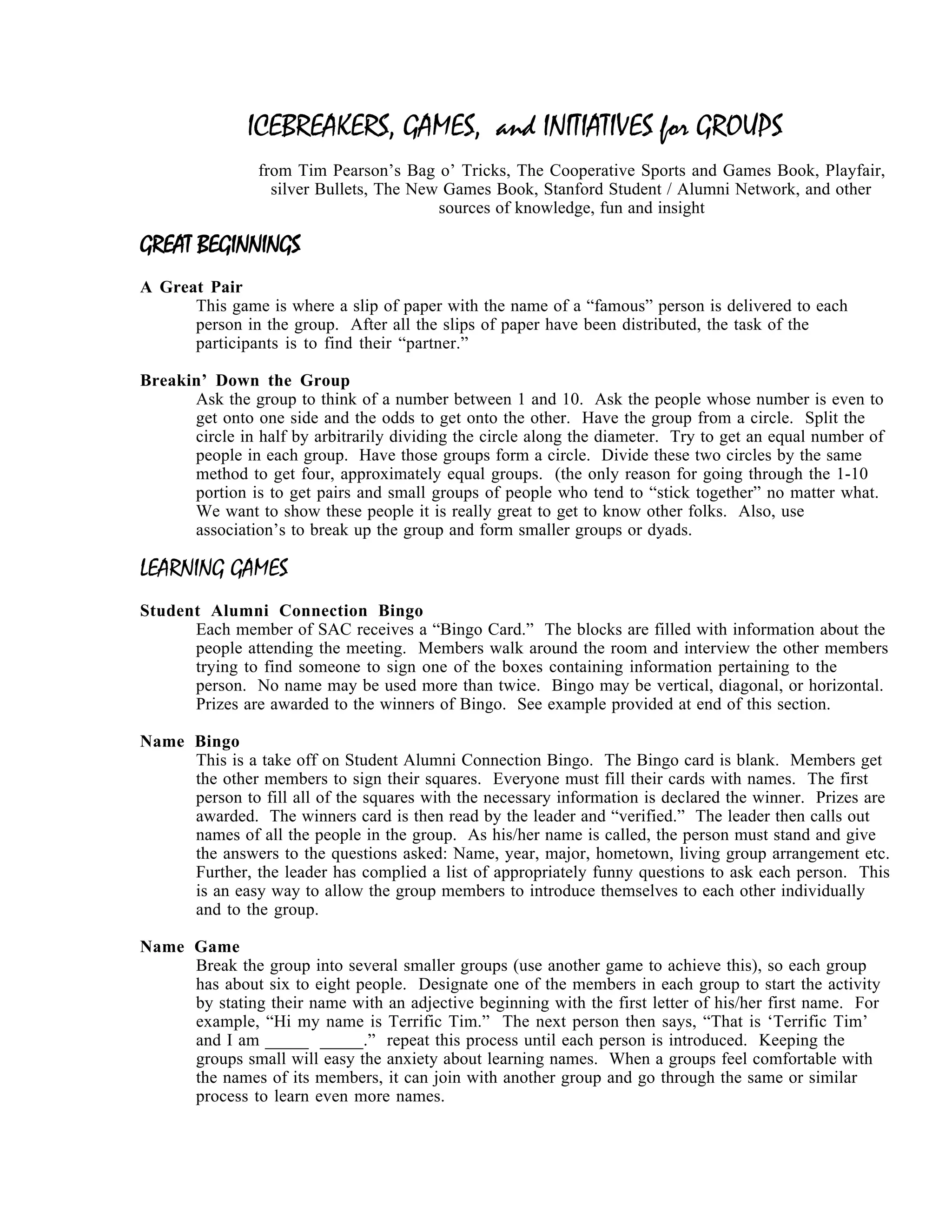 This document provides a collection of icebreaker games and activities for groups, including games to help participants learn each other's names like Name Bingo and Name Train. It also includes interactive games like Incorporations that require people to quickly form new groups based on different criteria to meet new people. The games aim to help break the ice and get conversations started within a group setting.