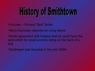 The document provides an overview of Smithtown, including its history and current schools, restaurants, and stores. Richard "Bull" Smith founded Smithtown in the mid-1600s after making an agreement with local Indians. Today, Smithtown has several schools that educate students from kindergarten through high school, as well as restaurants like Hotoke for Japanese food and Butera's for Italian. Additional stores mentioned include Uncle Giuseppe's marketplace and Pick of the Litter pet store.