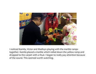 The document describes Kamila, Madisyn, and Victor playing together with marble runs. They experimented by adding different ramps, cups, and tubes to change the path of the marbles. Madisyn was enthusiastic and had ideas to expand their creation. Together they problem-solved issues and collaborated to build an elaborate marble run structure. Their families observed that the children were learning skills like problem-solving, collaboration, and persistence through creative play.