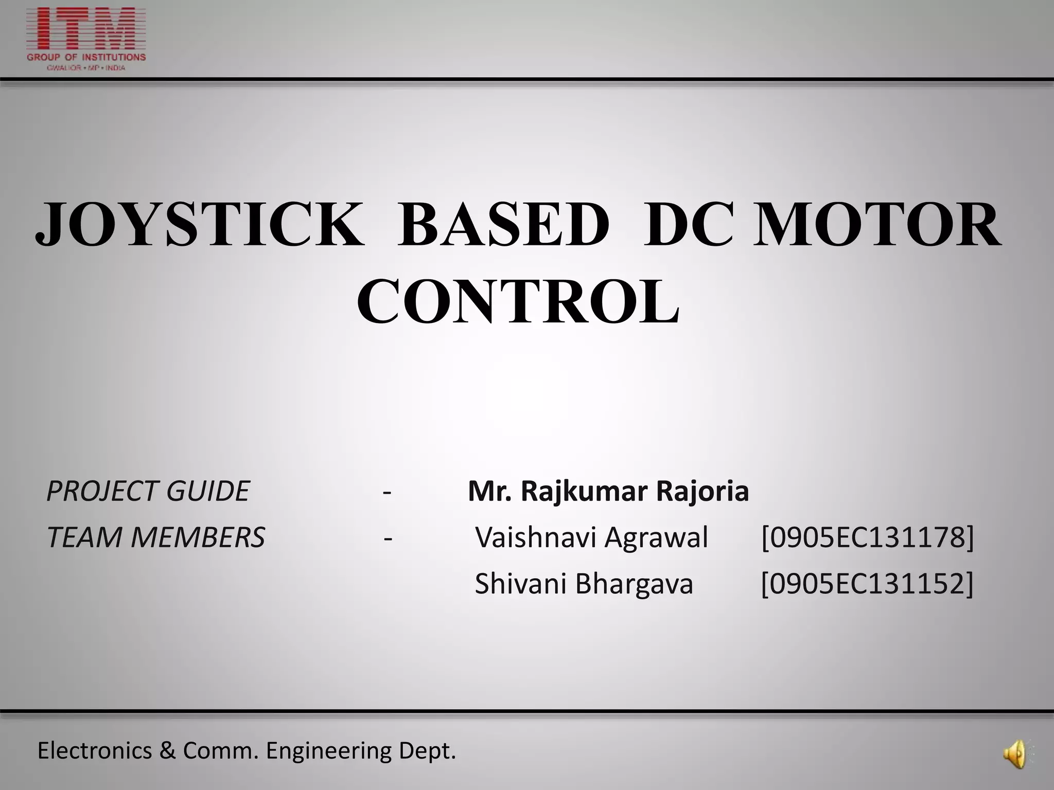 This document outlines a project guide for controlling DC motors using a joystick, highlighting the necessary components such as an ATmega16 microcontroller and PWM technique. The project includes detailed sections on requirements, block diagrams, operation concepts, and applications in fields like robotics and remote-controlled vehicles. Additionally, it provides the project schedule, budget, and references for further reading.
