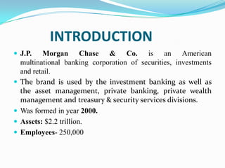 J.P. Morgan Chase & Co. is an American multinational banking corporation founded in 2000 with $2.2 trillion in assets and 250,000 employees operating in 150 countries. The company aims to strengthen communities through expanding access to capital, leadership, and leveraging resources. Jamie Dimon serves as Chairman and CEO, overseeing diversity recruiting efforts led by Mark Settles. The company hosts "Lunch and Learns" with top executives and has various employee networking groups to attract, retain, and develop a diverse talent pool. J.P. Morgan Chase strives to link management rewards to diversity progress and build a diverse pipeline through universities and industry groups.