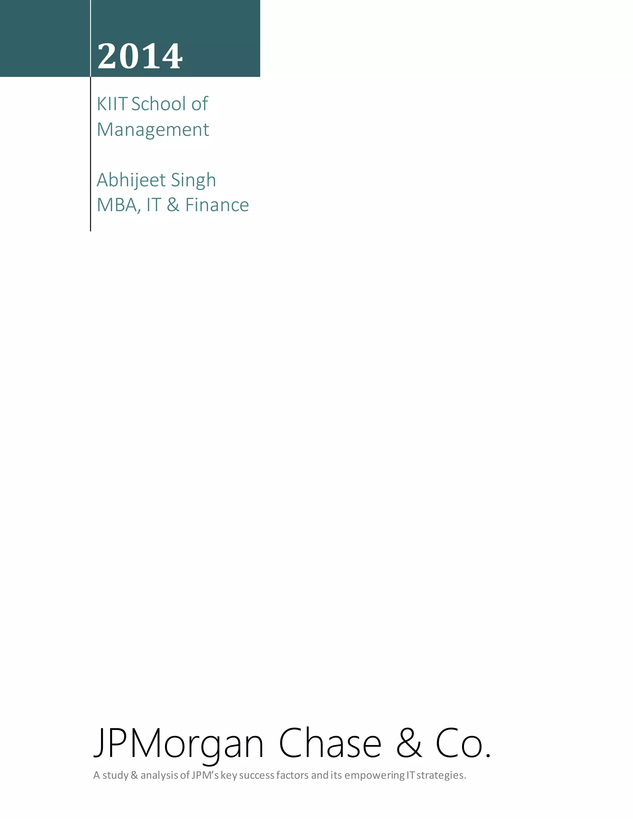 JPMorgan Chase is a large U.S. banking and financial services company formed in 2000 through the merger of JPMorgan & Co. and Chase Manhattan Bank. The document discusses JPMorgan Chase's key strengths including its large capital base, strong domestic presence, and mature brand. It analyzes the company's SWOT and describes several important IT applications developed in-house like Athena, CBB, and ERTRS that support its business operations. JPMorgan Chase invests heavily in IT, developing customized solutions and pursuing automation to gain cost advantages and efficiencies.