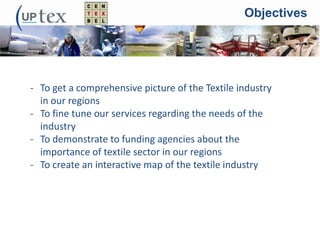 A survey of textile companies in Northern France and Belgium was conducted with the objectives of understanding the industry, identifying needs, and demonstrating the sector's importance for funding. A web-based survey was sent to 450 companies, with 91 responding by September, representing 12,498 employees across 46 French and 45 Belgian companies with average employment of 145 per company and total turnover of 2.9 billion euros. The survey gathered information on innovations, markets, raw materials, and production processes in the textile industry.