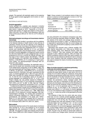 3) The amyloid-β aggregate-induced currents were dependent on extracellular calcium and disrupted calcium-dependent currents between oocytes and surrounding follicular cells. Electron microscopy also revealed dissociation of follicular cells from the oocytes.