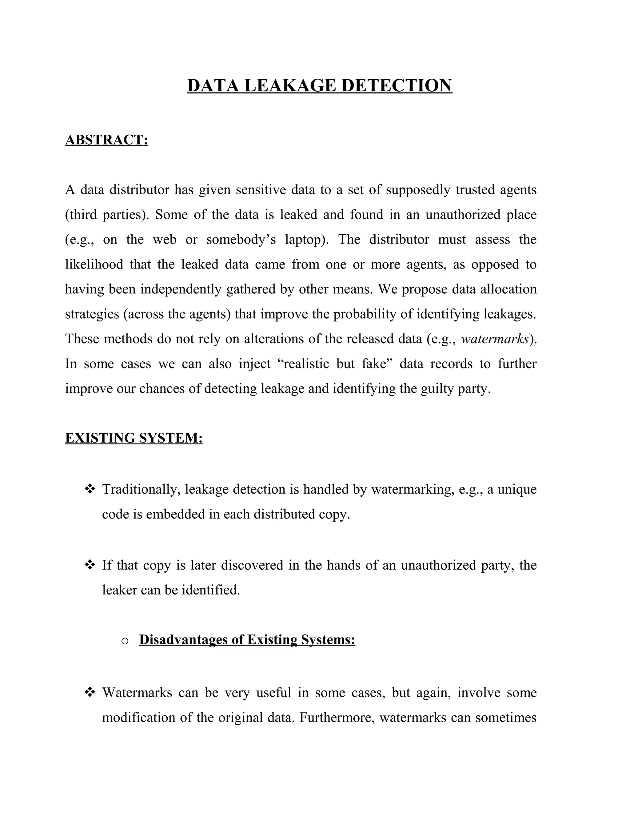 This document describes a system for detecting data leakage when sensitive data is distributed to third party agents. It proposes strategies for allocating data across agents to improve the ability to identify leaks. These strategies include injecting fake records to act as watermarks without modifying real data. The system models agent guilt and develops algorithms to optimize data distribution and detect leaks. It includes modules for data allocation, fake objects, leakage protection, and identifying guilty agents.