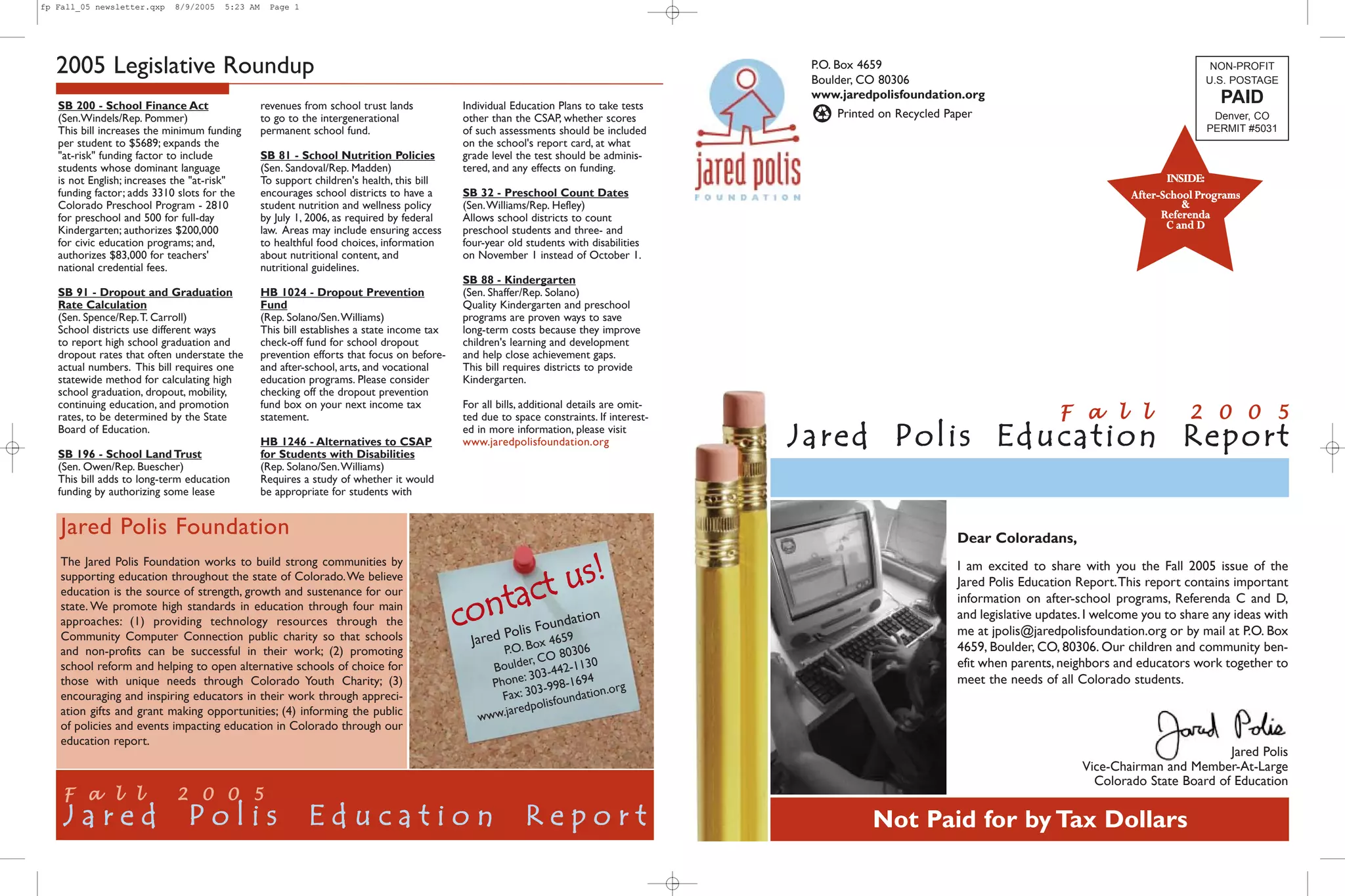 The Fall 2005 Jared Polis Education Report outlines new legislative initiatives in Colorado focused on enhancing education funding, nutrition, and dropout prevention measures while informing the public about important upcoming ballot measures. Key bills include increased minimum funding per student, the establishment of nutrition policies, and the promotion of after-school programs. The report encourages community engagement and support for educational resources and programs aimed at improving children's learning outcomes.