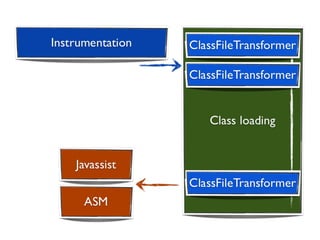Документ обсуждает использование библиотеки Javassist в контексте Java-разработки, включая ее применение для генерации прокси-объектов. В работе также описываются механизмы байткод-инструментации и предоставляются примеры кода для настройки Java-агентов. Основное внимание уделяется интеграции Javassist с другими фреймворками, такими как JRebel и Hibernate.