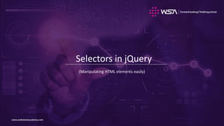The document provides an overview of jQuery selectors and event handling, emphasizing how to manipulate HTML elements easily using jQuery. It highlights various CSS3 selectors, their syntax, and practical examples for selecting elements and handling events like clicks and form submissions. Additionally, the document includes exercises for implementing event handling with various HTML elements.