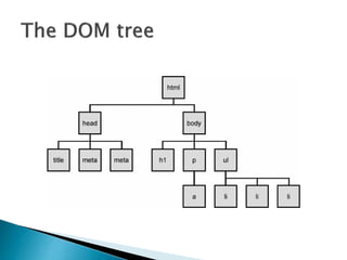 jQuery is a JavaScript library that simplifies HTML document traversal, event handling, animating, and Ajax interactions. It allows developers to write less code that does more. Some key features of jQuery include its use of CSS selector syntax to select elements, methods for traversing and manipulating the DOM tree, and ability to bind event handlers. jQuery also helps developers work with the DOM in a cross-browser compatible way, such as executing code when the DOM is ready without waiting for images and stylesheets to load.
